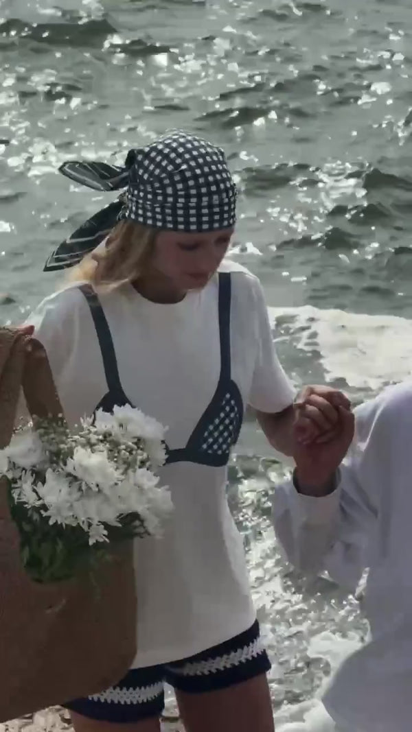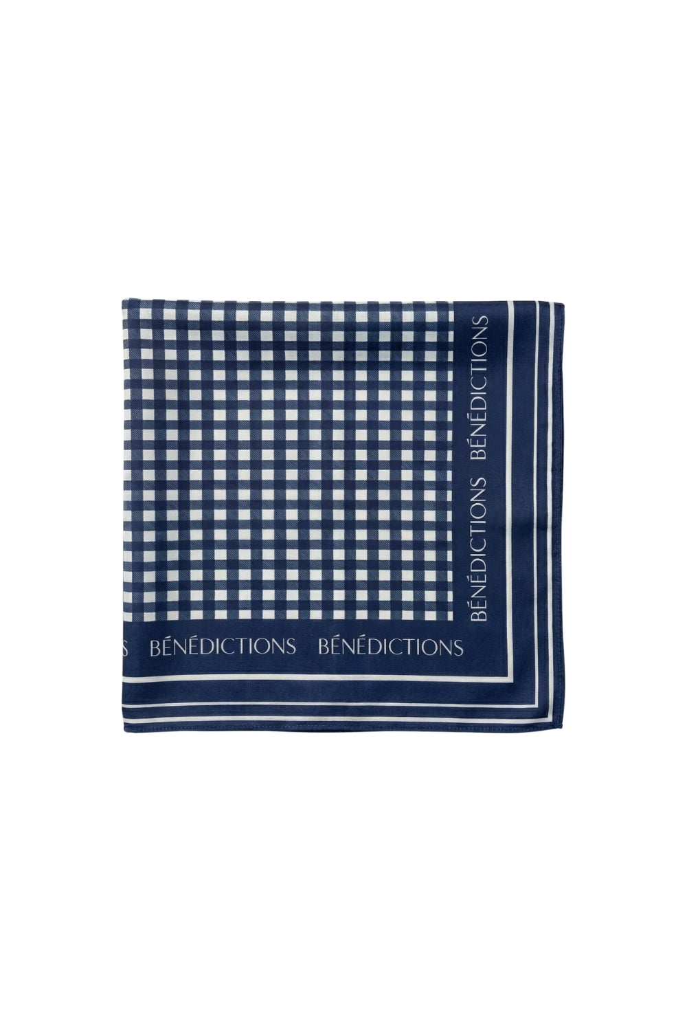 Bandana en 100% poliéster con estampado Vichy en azul navy y marfil, realzada con marco perimetral y el logo BÉNÉDICTIONS integrado en el contorno. Ligera, suave y versátil, ideal para usar al cuello, en la cabeza, en el cabello o como accesorio para bolsos.
