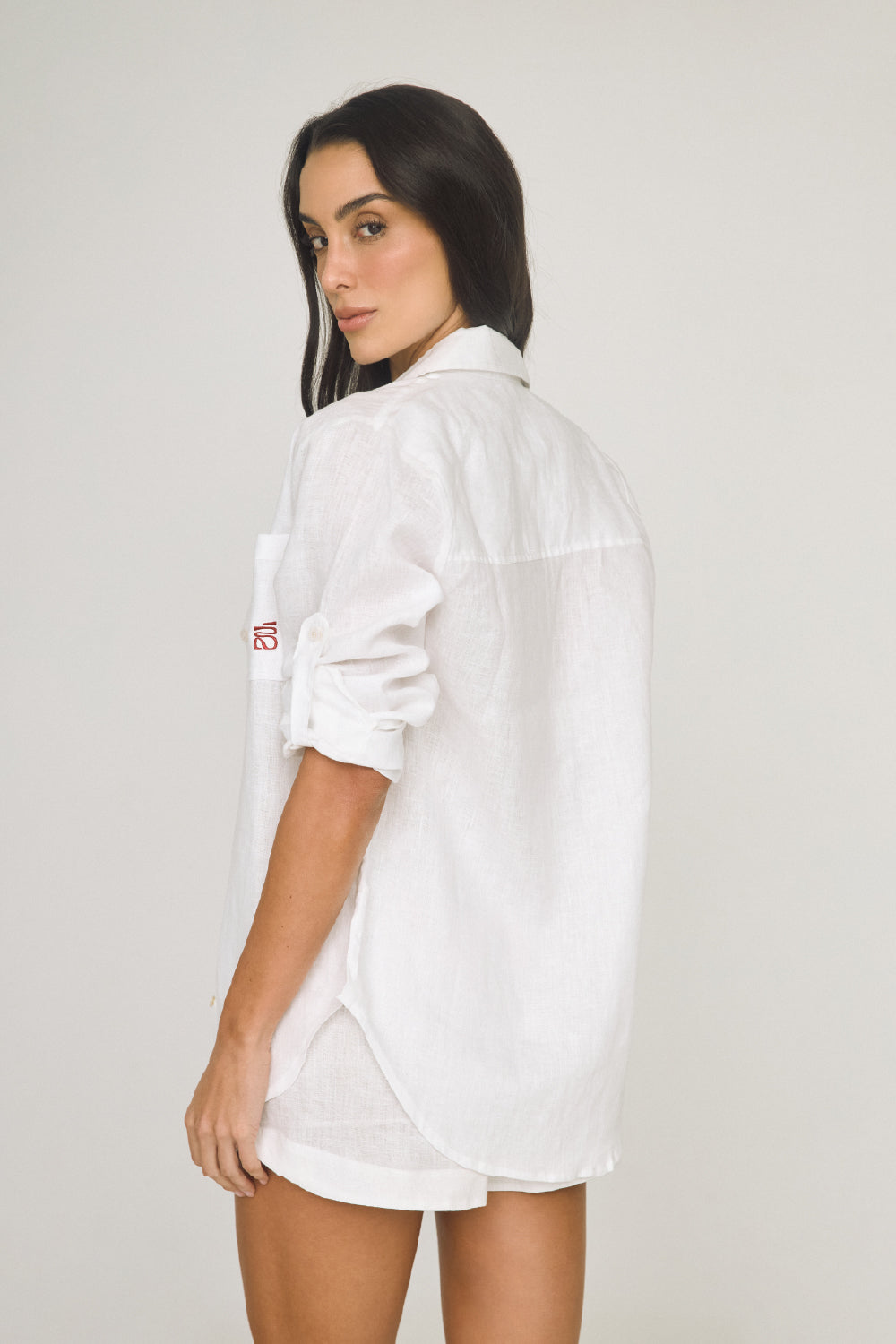 La camisa tiene una silueta relajada, con botones frontales, bolsillo lateral y un bordado sutil del logotipo que añade un detalle distintivo.
