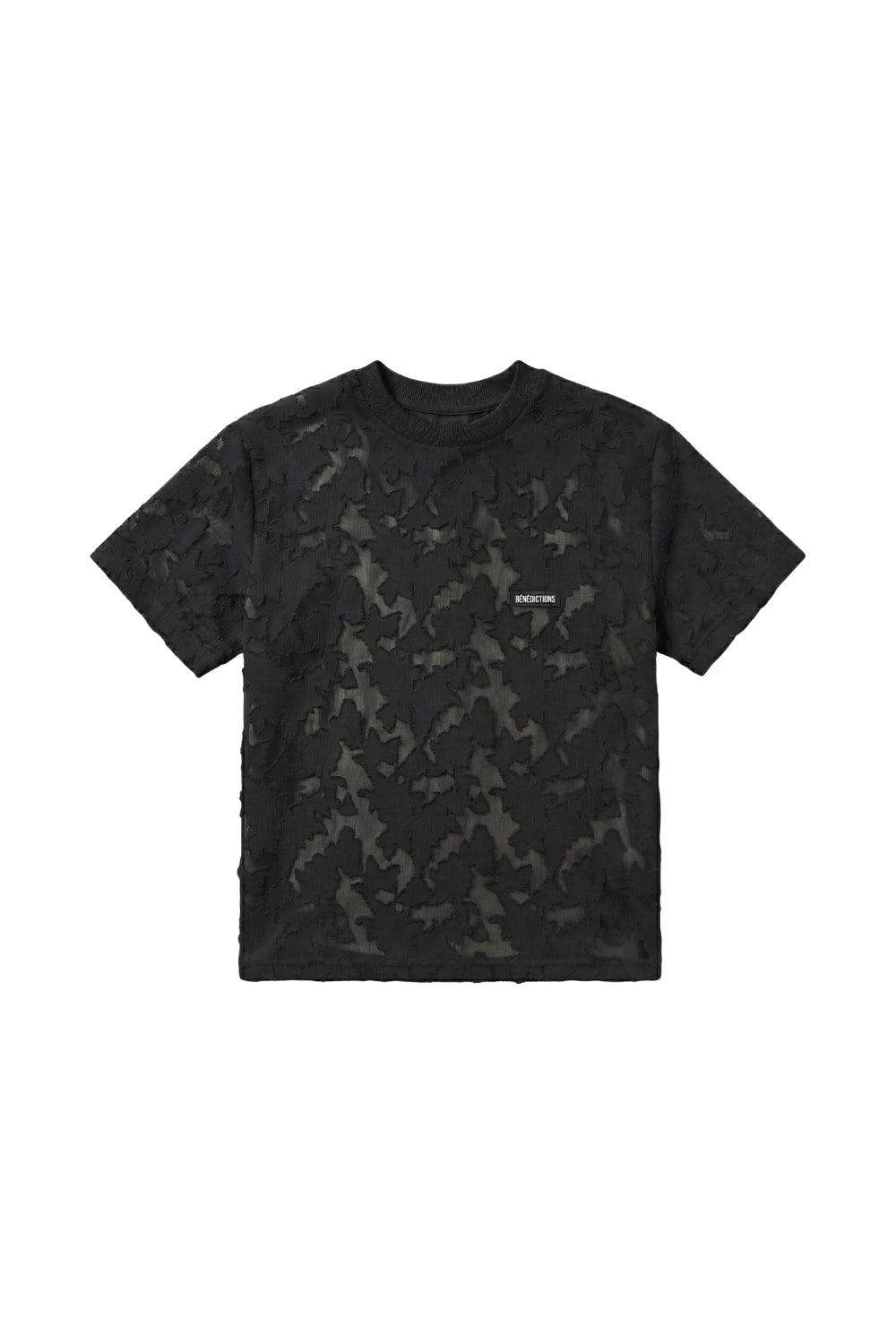 Camiseta elaborada en un mesh importado con textura floral en relieve, que combina transparencia y elegancia en una sola pieza.