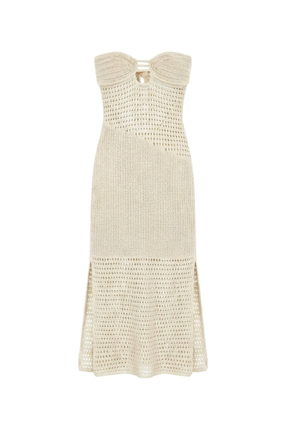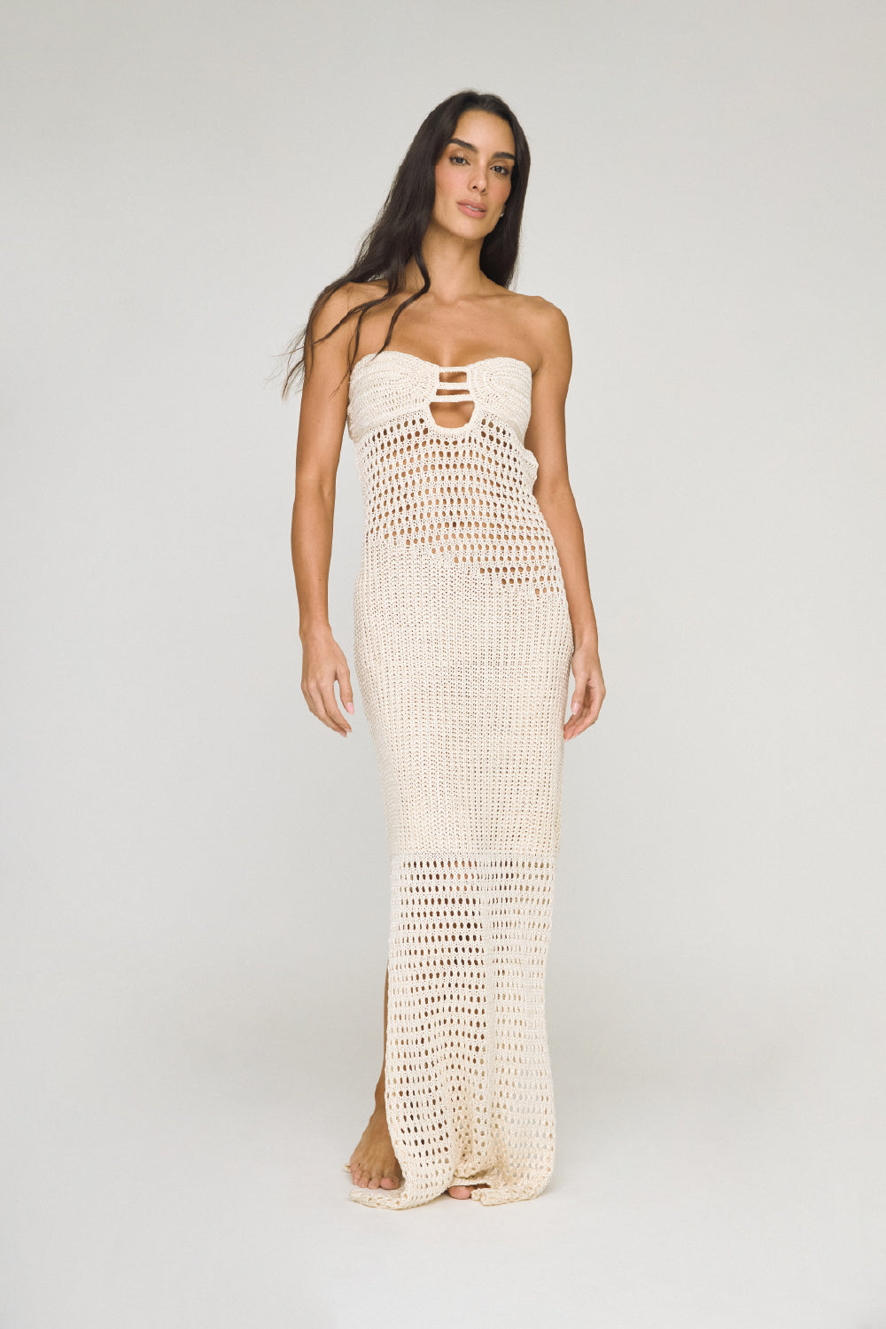 La parte superior incorpora un top strapless tejido en crochet, que hace parte del diseño del vestido y aporta un toque artesanal, femenino y moderno. Incluye aberturas decorativas y un amarre posterior que permite un ajuste perfecto, destacando la espalda descubierta.