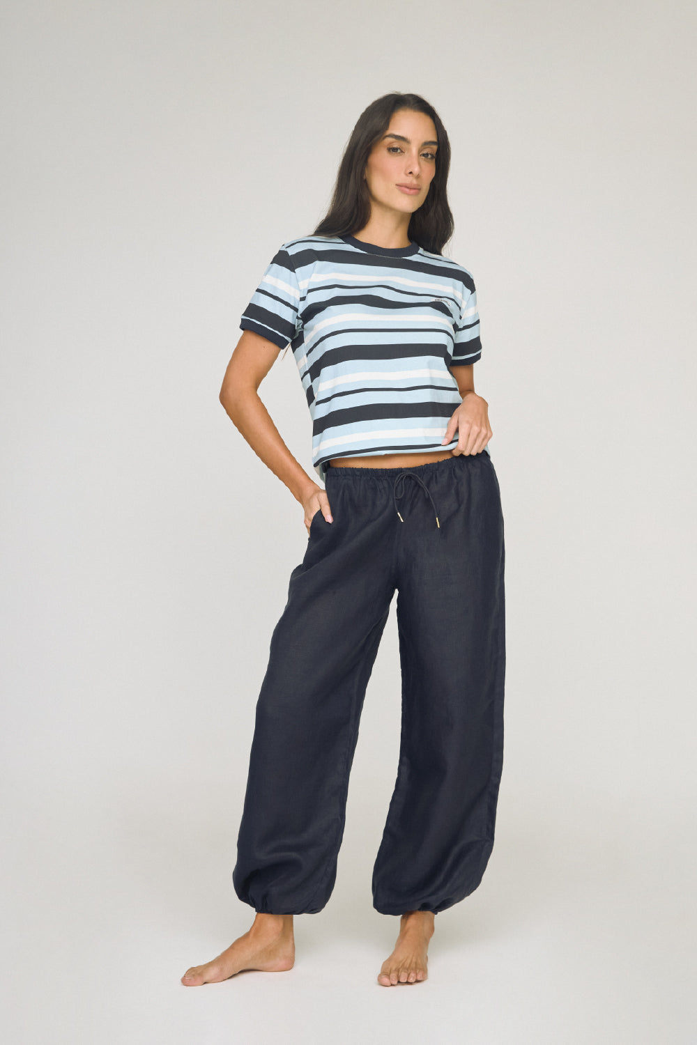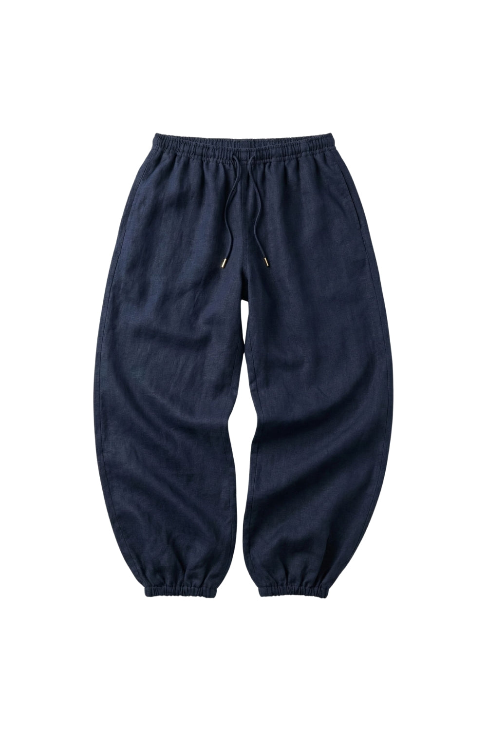 Su pretina enresortada con cordón ajustable define la cintura sin perder la fluidez natural del lino, mientras que los bolsillos laterales añaden funcionalidad y un toque relajado.