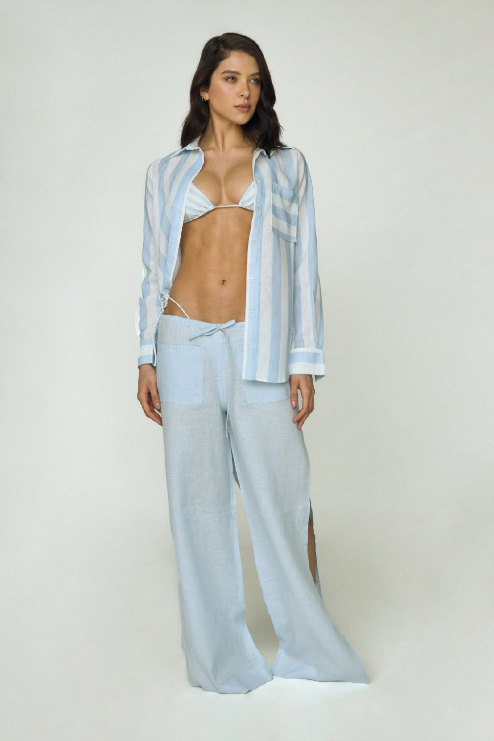 Pantalón elaborado en 100% lino, con cintura ajustable y tiro bajo. Presenta aperturas en los costados que aportan frescura y movimiento, además de bolsillos delanteros decorados con un delicado logo bordado.