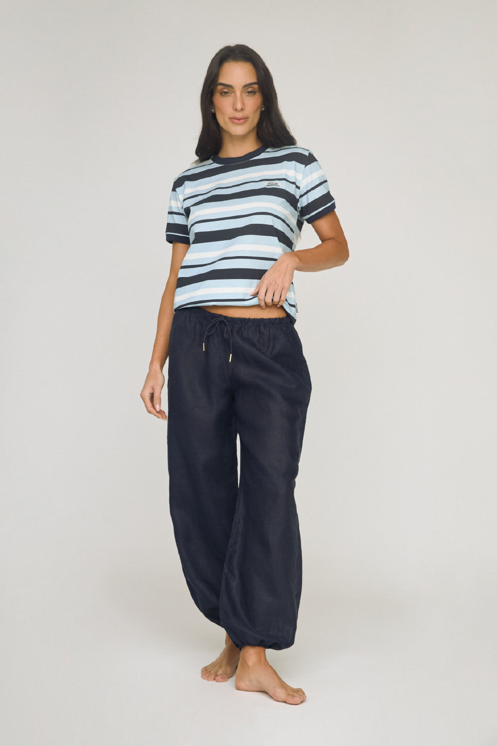 • Diseño de rayas en tonos azul y blanco