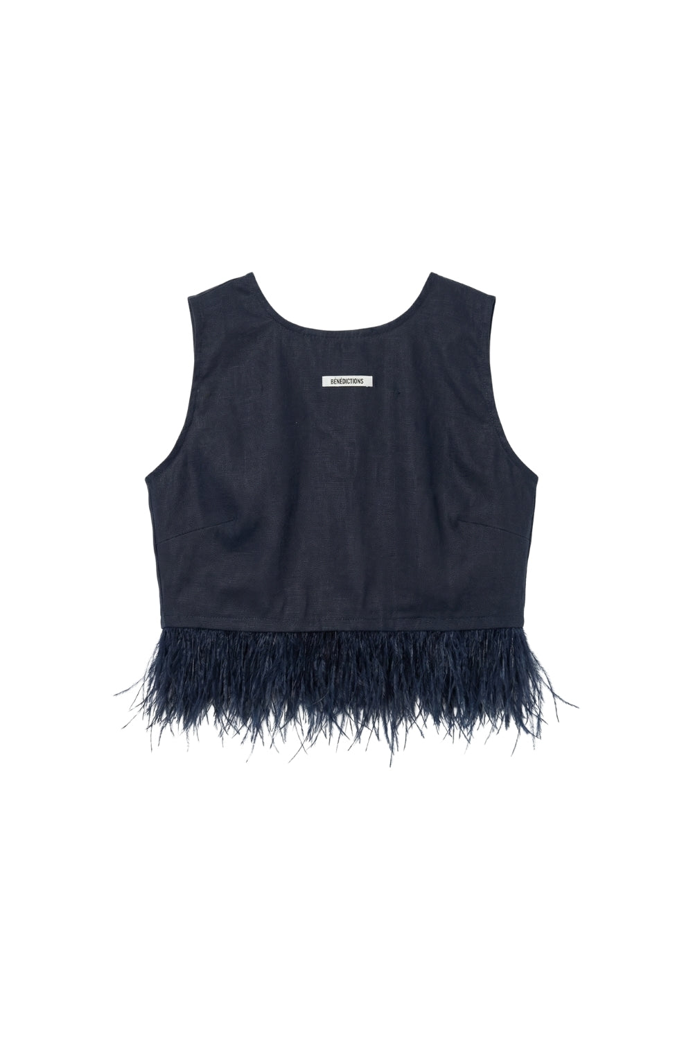 Este top elaborado en 100% lino premium es una pieza sofisticada que combina líneas limpias con un toque de textura y movimiento. Su silueta recta y minimalista se equilibra con el detalle de plumas tono a tono en el bajo, que aporta un acabado elegante y contemporáneo.