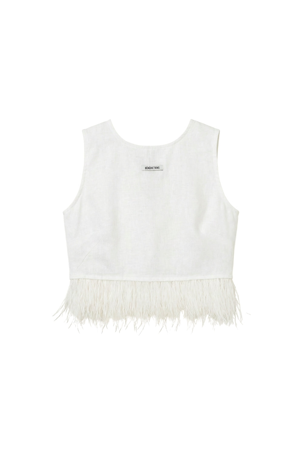 Este top elaborado en 100% lino premium es una pieza sofisticada que combina líneas limpias con un toque de textura y movimiento. Su silueta recta y minimalista se equilibra con el detalle de plumas tono a tono en el bajo, que aporta un acabado elegante y contemporáneo.